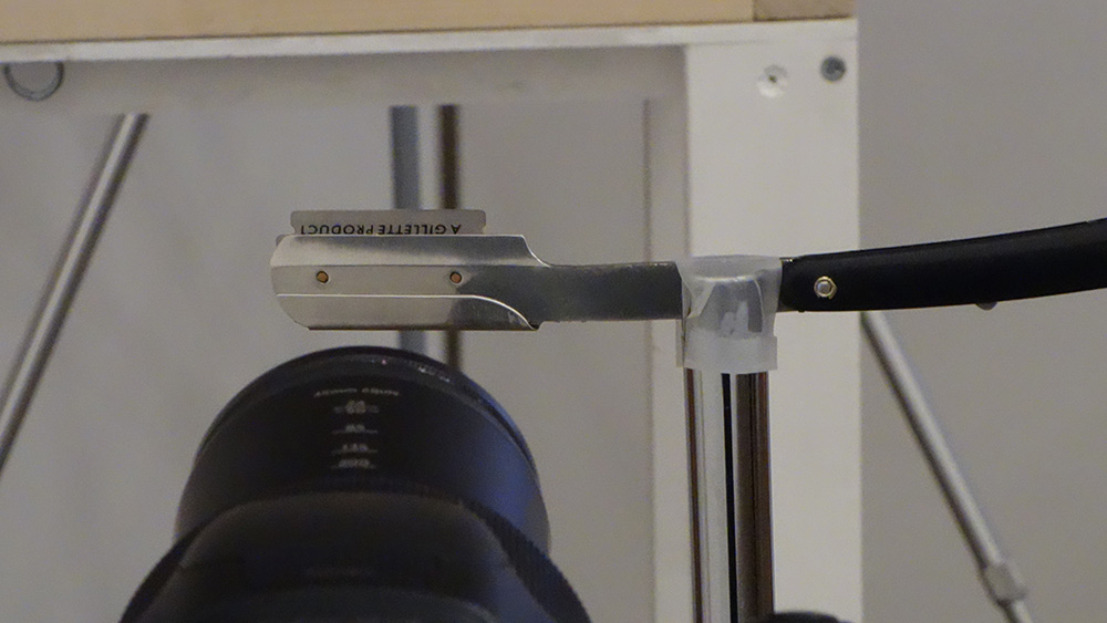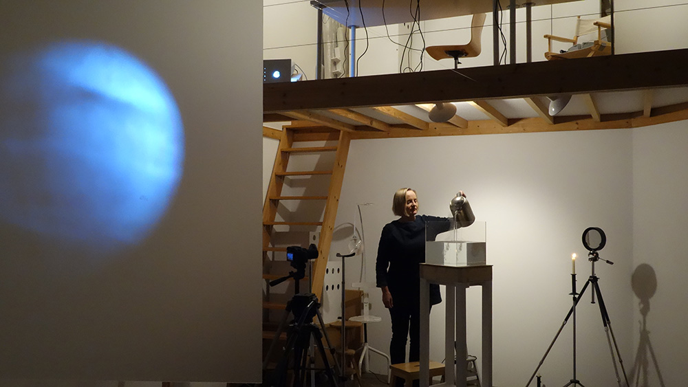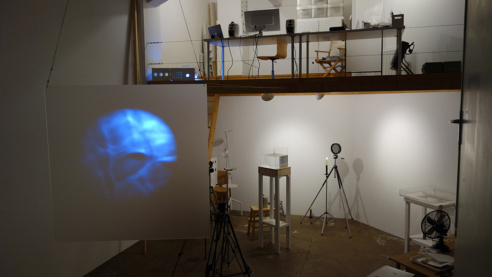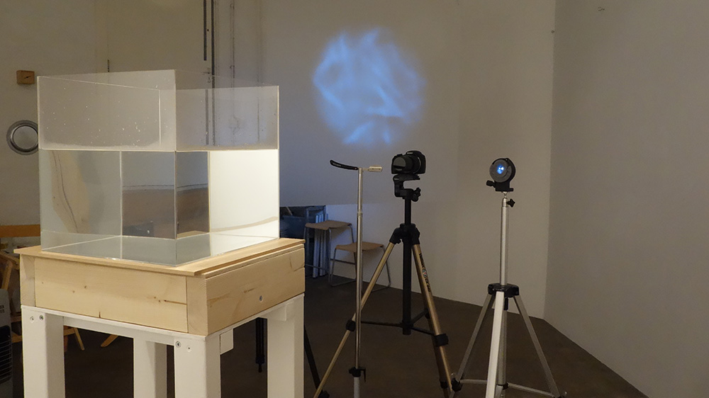 In this installation the Schlieren effect is caused by an LED light being shone into a Primary Telescope Mirror and then reflected onto an open razor blade, which partially blocks the light and so allows the air currents to become visible. A candle causes hot air currents to rise in front of the concave mirror, wafted by an electric fan. As a further experiment, a tank of water has been placed within the camera sight line, into which boiling water is added to alter the currents observed through the camera screen. Recordings of this view have then been rear projected onto a screen suspended from the studio ceiling.