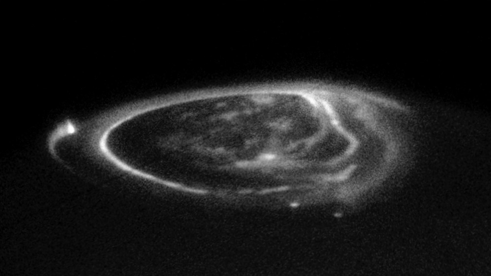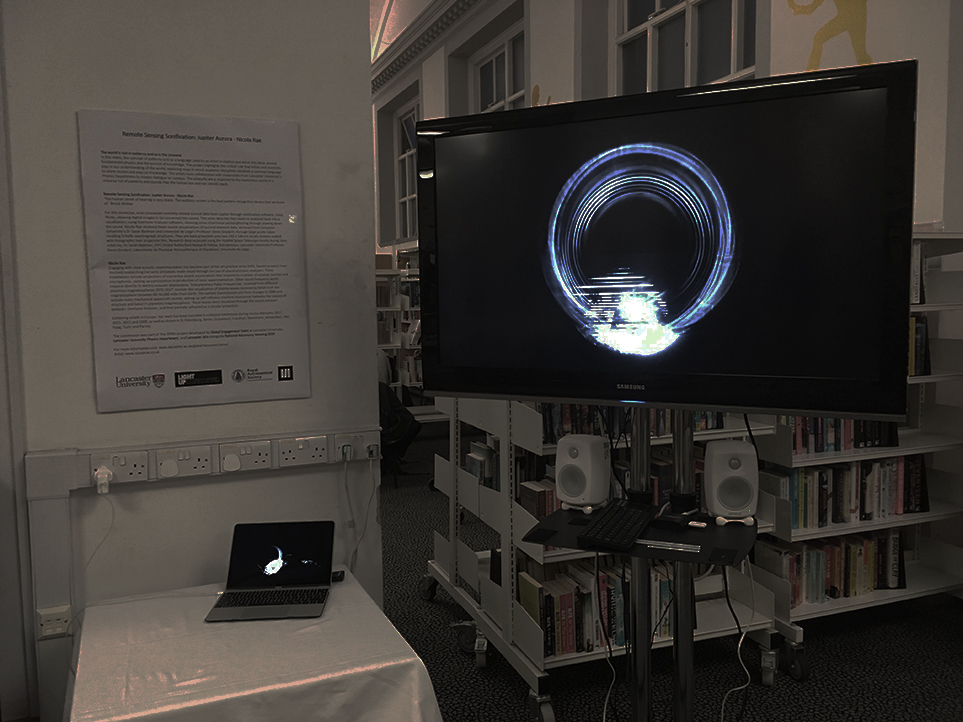 My collaboration with Dr Sarah Badman led to accessing her original Hubble Space Telescope observations of Jupiter’s ultraviolet aurorae. These observations were mostly captured at the same time that Juno was orbiting Jupiter and receiving radio waves in response to magnetospheric activity. The complex connection between the auroral brightness and magnetospheric processes has been researched by Sarah: "We are entering a new era of understanding of giant planet environments thanks to the Juno mission at Jupiter and concurrent Hubble Space Telescope images of Jupiter’s UV aurora. The combination of these measurements allow us to probe how the vast magnetosphere responds to changes in the external (e.g. solar wind) and internal (e.g. the volcanic moon Io) conditions." (Badman, 2019) The sonification and sound visualisation of this interrelationship between Jupiter's auroral ionosphere and its magnetospheric activity became the focus of my dual screen installation for SPINE. The nearest projection focused on sonifications of Badman’s Hubble observations of Jupiter’s aurorae. The furthest projection focused on sound visualisations of radio signals received by Juno from Jupiter and recorded by the Waves instrument (University of Iowa). These included radio waves of the bow shock of Juno passing between the interplanetary solar wind environment and Jupiter’s magnetosphere; receiving plasma wave signals at an increasing density while the Juno spacecraft interacted with the charged particles of Jupiter’s ionosphere on Perijove 4; and Juno receiving signals from Jupiter’s intense auroras (Kurth, 2016)
