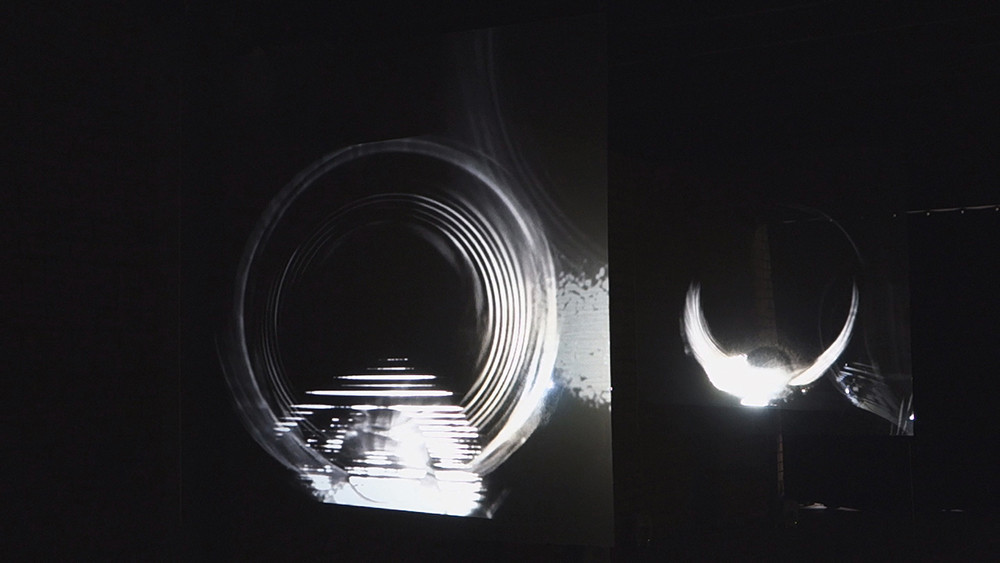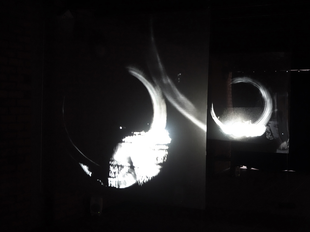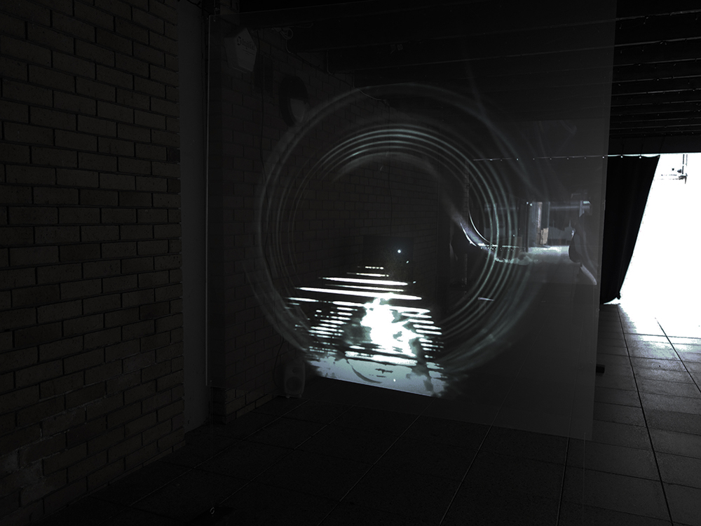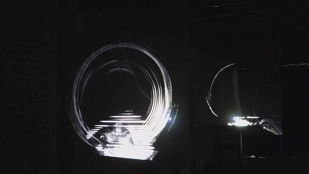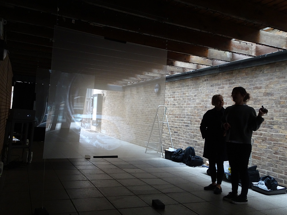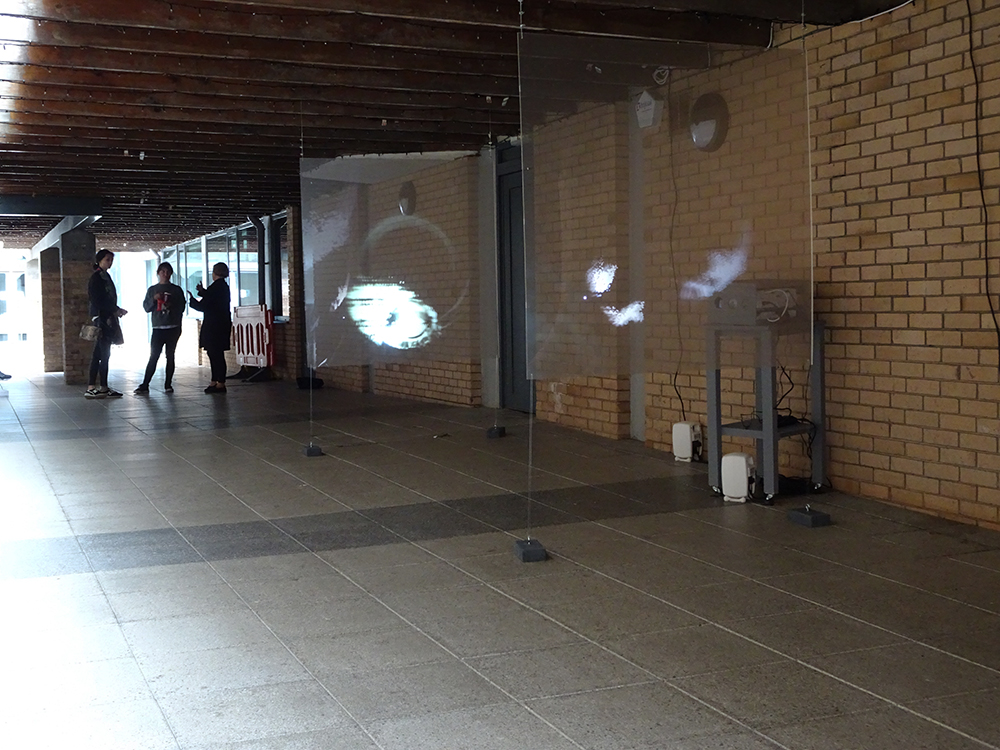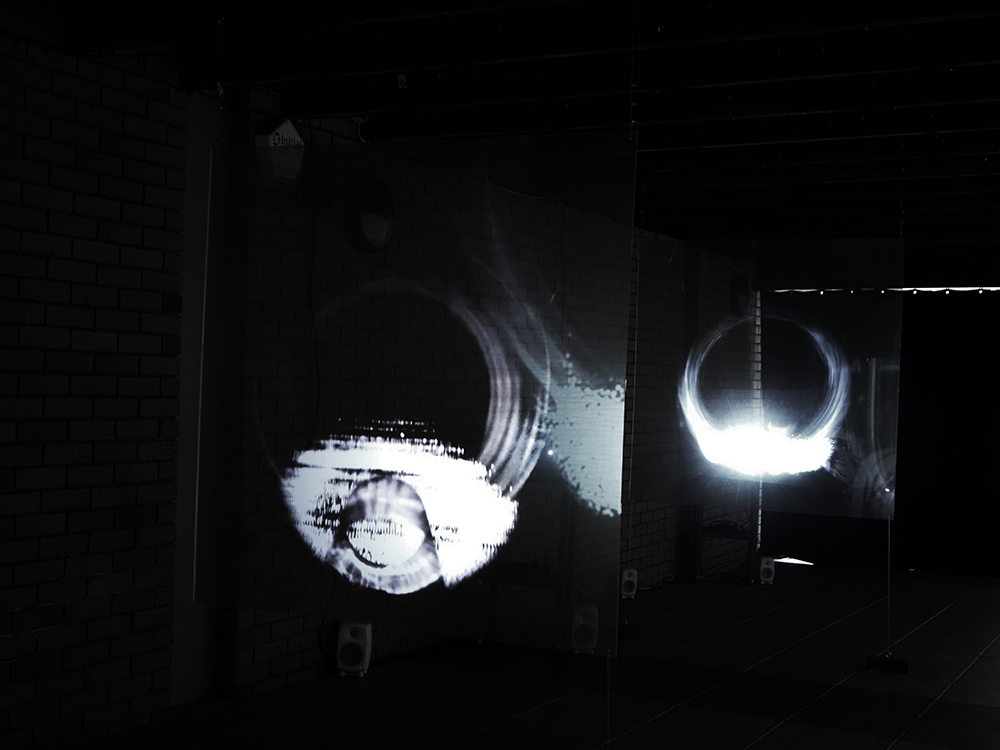 Remotely sensed auroral data from Jupiter (lower left) has been processed through sonification software, Sonic Photo, allowing digital images to be converted into sound. This sonic data has then been re-analysed back into a visualisation (lower right), using Overtone Analyzer software, showing some partial glitching through slowing down the sound. The sonified and re-visualised auroral research data was projected through large acrylic tubes to become revolving striated structures that recall Echelle spectrographs. In the SPINE underpass they were back projected onto 140 x 140 cm acrylic screens coated with holographic rear projection film (see above). |