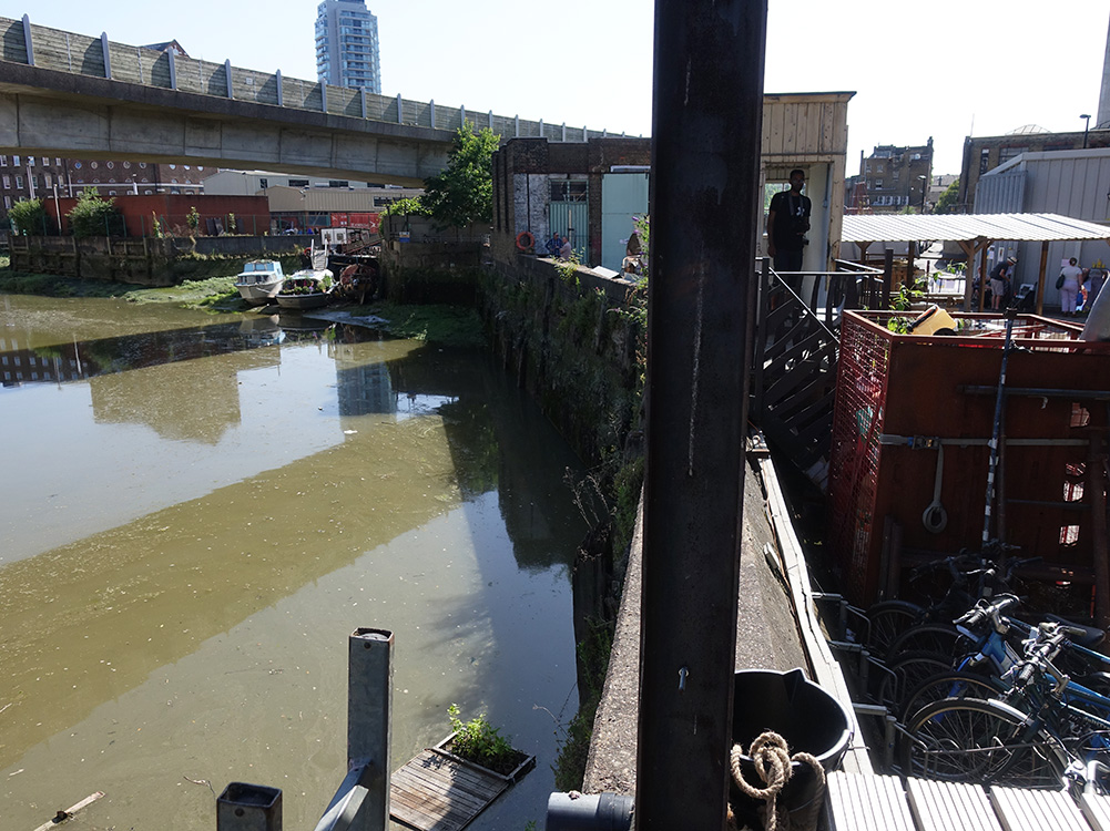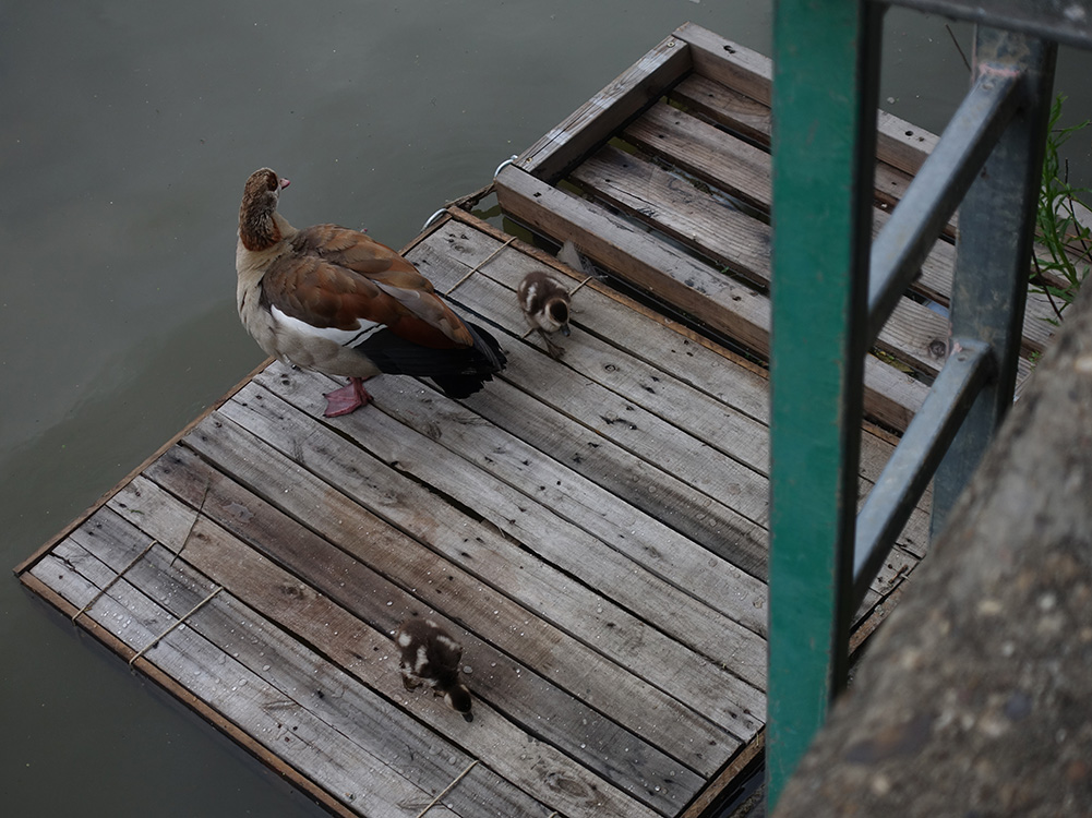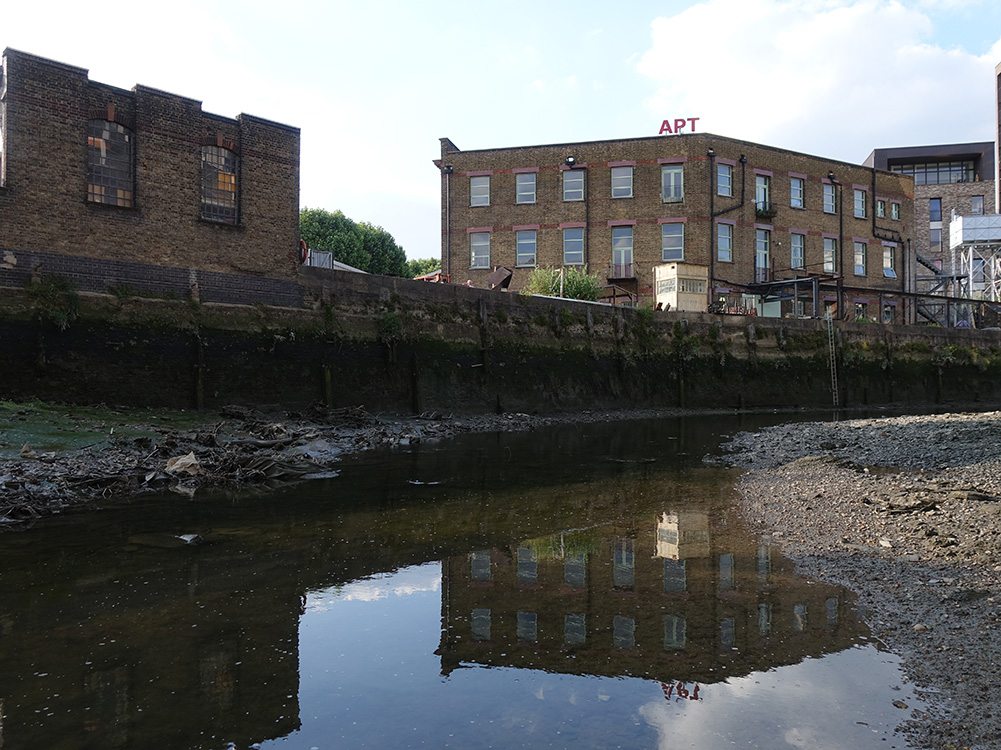 Left: First floating of the raft with visiting Egyptian geese family. Right: Art in Perpetuity Trust studios (APT) from Deptford Creek.