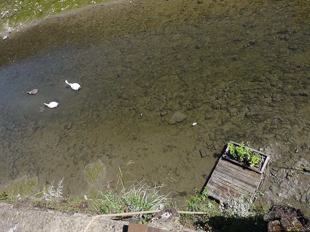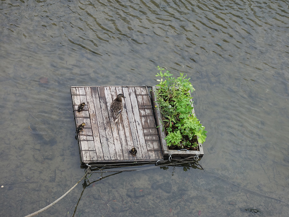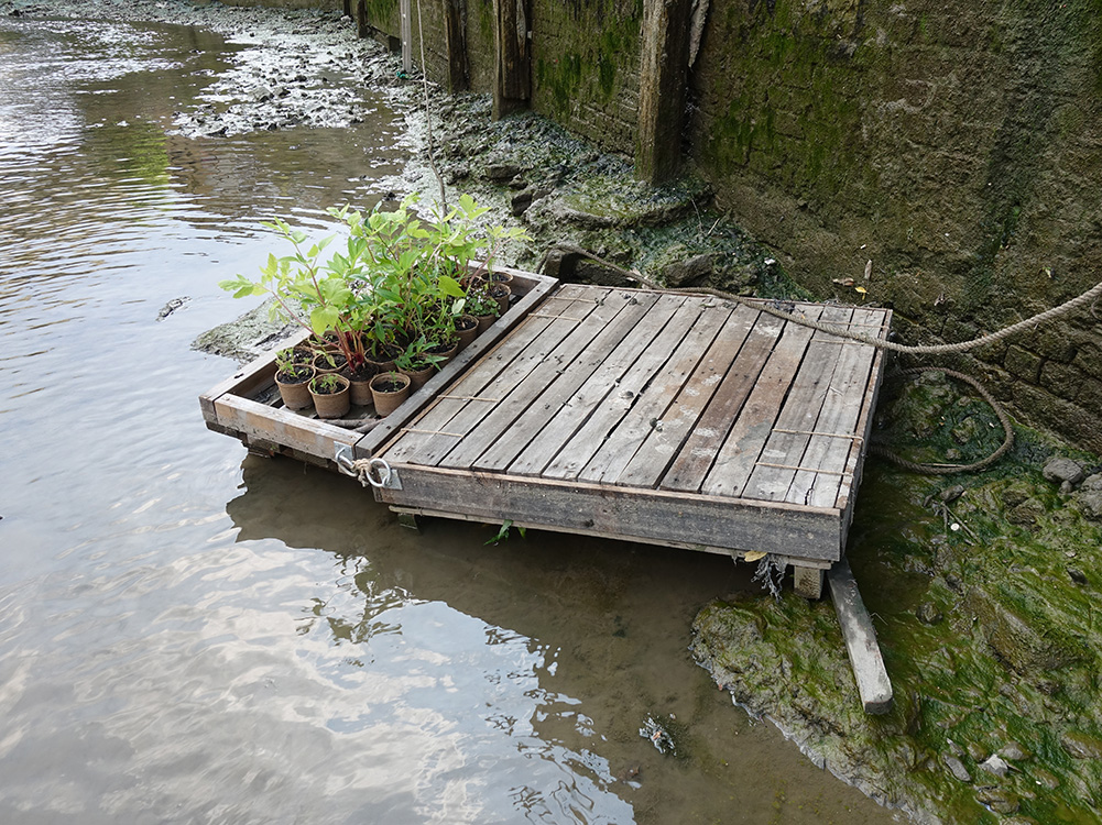 Deptford Creek has a very large tidal range and safe nesting and resting sites are much needed by the waterfowl. Two connected rafts were floated in the creek to provide a haven. One was planted with wildflowers recorded as growing on the intertidal walls between 1997-99 in Deptford Creek: Surviving Regeneration (Steele, 1999). Angelica Archangelicas, Sea Asters, Ivy Leaved Toadflaxes, Gypsywort, Celery-leaved Buttercups, and Water Figworts were all planted in biodegradeable pots made from wood and sustainable sphagnum peat and potted with coir compost. These wildflowers self-seeded adding to the food source for visiting birds. The second raft provided a resting place for waterfowl and was initially frequented by two Egyptian Geese and their goslings. Both rafts were made from disused palettes and wood salvaged from APT yard after their re-use was discussed with other artists.