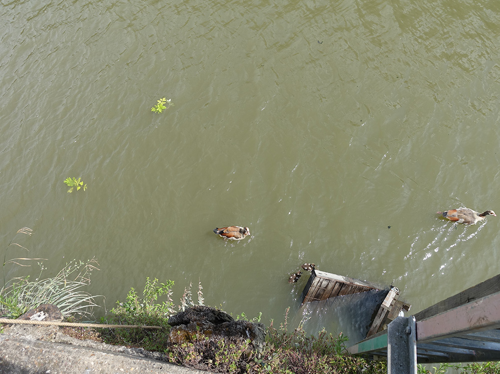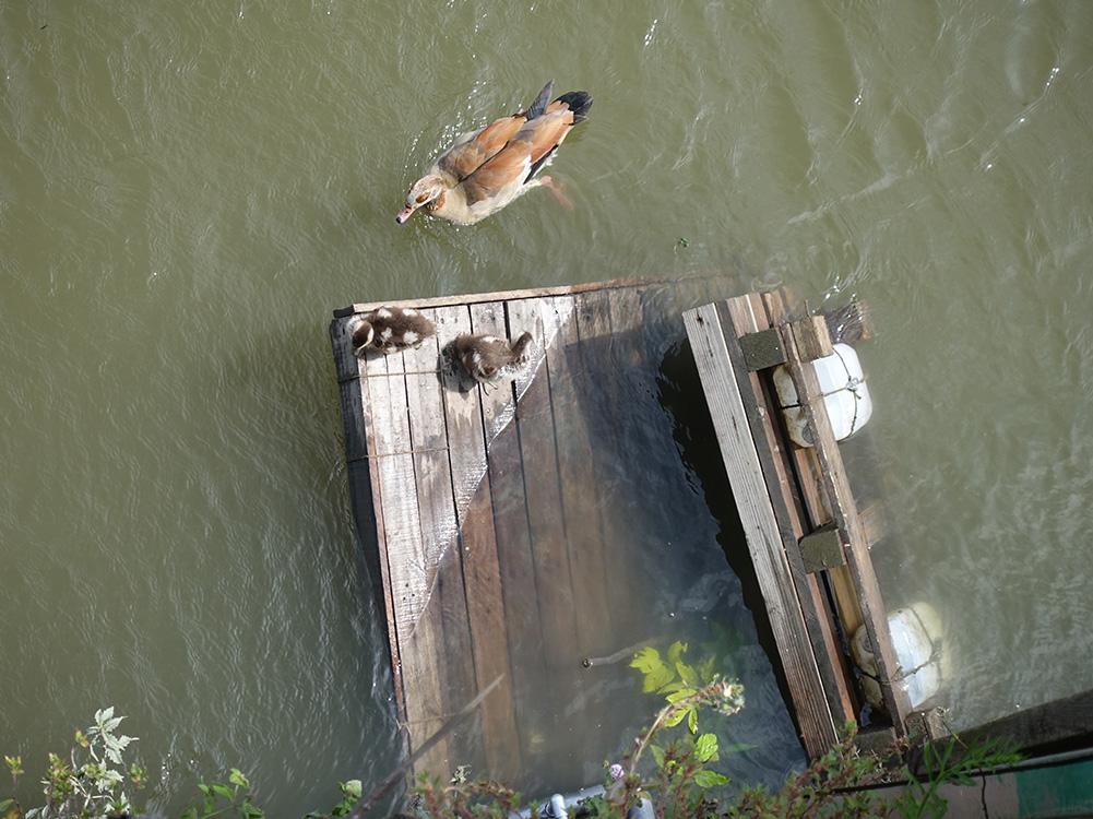 Below: A week later the long raft ropes caught under the ladder and forced the raft down on the rising tide. Most of the plants survived but some Anglicas floated down the creek towards the Thames in their biodegradeable pots to take root elsewhere. The Egyptian geese family were not deterred.