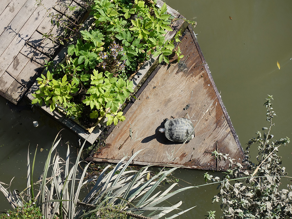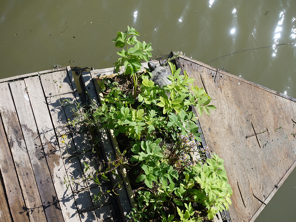 Below: Paul and I remade the raft with triangular ends to withstand larger amounts of flotsam collecting around it particularly after flood tides. A Red-Eared Slider Turtle visited in September visible within the plants upper right (left image) and sunbathing the next day (right image).