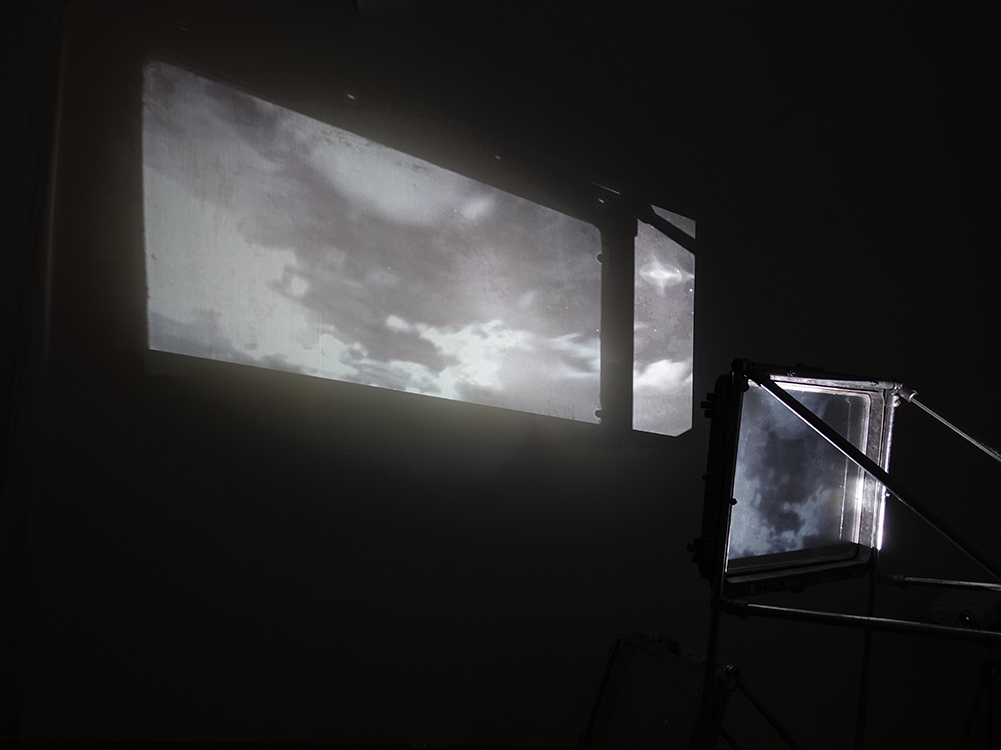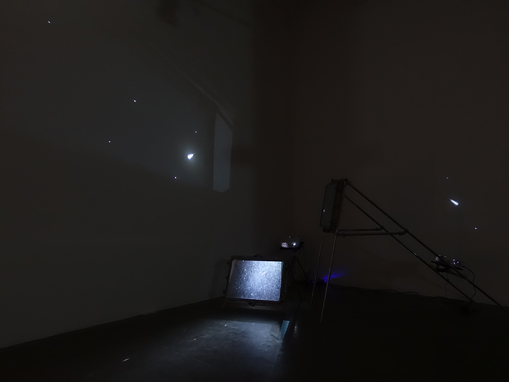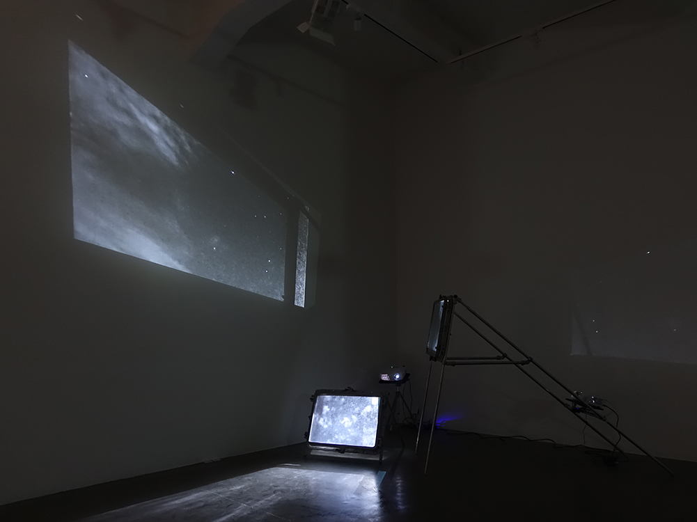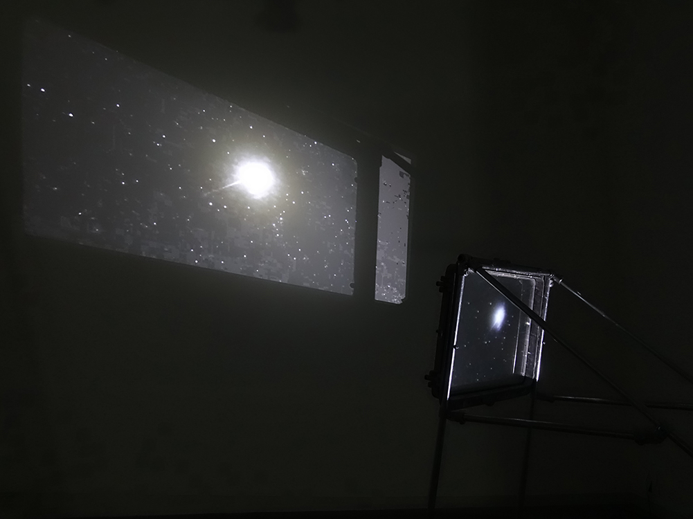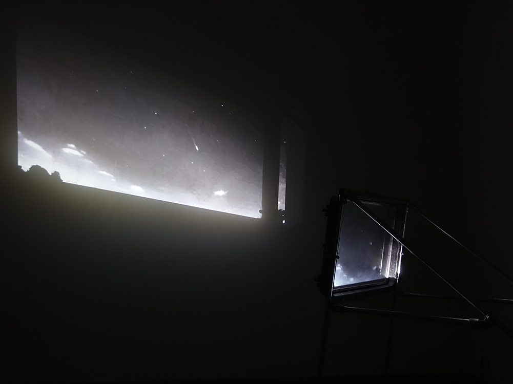 UKMON's films have been reframed through being back projected onto weathered aluminium portholes salvaged from a WWII concrete minesweeper in Essex, throwing images forwards and backwards within the space. The installation continually shifts focus between porthole screens, allowing the transitory appearances of meteors and fireballs to retain an unpredictability of presence and trajectory.